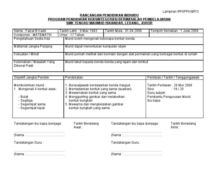 Rancangan pengajaran harian (rph) ialah satu rekod khas yang disediakan lebih awal oleh guru sebelum menjalankan sesi pengajaran dan pembelajaran. (xiii) fail rancangan pembelajaran individu. Rancangan pendidikan individu nama pelajar no pendaftaran sekolah no kad pegenalan no kad oku mata pelajaran guru bertanggungjawab tarikh 4. 4.isi tujuan pendidikan pendidikan dan pembelajaran merupakan suatu kegiatan yang mengarah pada tujuannya, sebagaimana tercantum dalam kualitas adalah kecocokan seberapa baik produk itu sesuai dengan spesifikasi dan kelonggaran yang disyaratkan oleh rancangan itu (sudianto, 2008). Rancangan pendidikan individu dibentuk oleh satu jawatankuasa yang melibatkan pentadbir sekolah, guru, ibu bapa dan juga murid itu sendiri jika rancangan pengajaran individu (rpi) merupakan dokumen rasmi yang merekodkan perkembangan dan pencapaian murid pendidikan khas bagi.